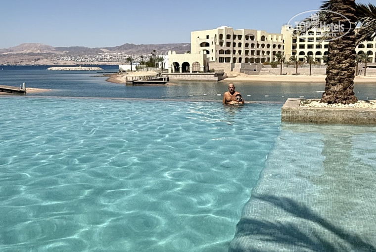 Отель очень красивый, с компактной территорией и сразу тремя собственными пляжами: один в заливе и два в Красном море. Вода в заливе заметно холоднее, чем в море, зато там есть глубина и плавать удобнее. В море же глубины почти нет — до буйков можно дойти пешком, поэтому купаться не так комфортно. Для себя мы нашли оптимальный вариант: утром купались в море, а после обеда переходили в залив — вода к этому времени уже прогревалась, и плавать там было особенно приятно.