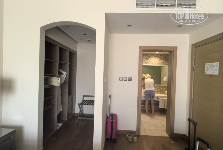 3) Номер: нам дали на третьем этаже в секторе 95, возле мини аквапарка. Номер свеженький, просторный. Доп. кровать ребенку дали без проблем и бесплатно. Кондиционер, расположенный не над кроватью, что позволяло оставлять его включенным даже ночью, сейф (бесплатно) телевизор, холодильник с баром (платный), чайник, чашки, чай, кофе, сахар сливки все входит в стоимость все включено. Много места для хранения, гладильная доска, утюг. Ванная комната большая. Фен. Балконf не было. Столик, два стульчика. Единственный нюанс: нет сушилок, но мы подготовились, взяли с собой веревку и натянули ее на перилах за окошком.