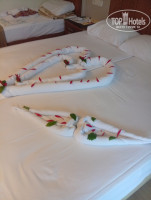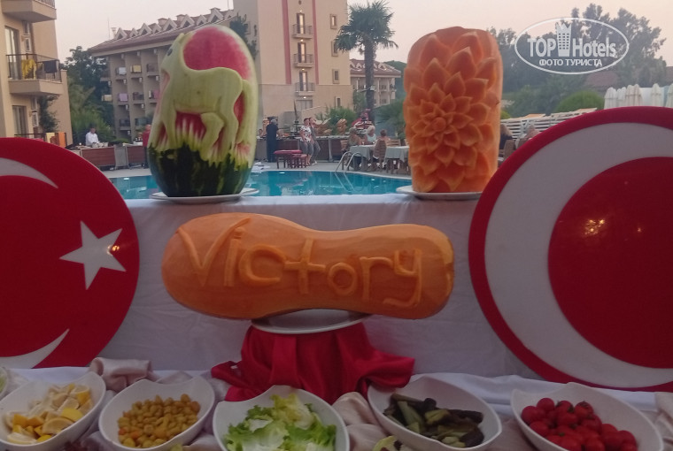 Отдыхали в данном отеле первый раз и надеюсь не последний, отель очень понравился, т. к приехали после 14 часов, заселили в номер сразу, в 4 й корпус, на первый этаж, номер стандартный, единственное смутила дверь(закрытая) в соседний номер, по ночам если соседи кашляли или плакали дети, то ощущение, что они лежат с тобой на кровати, ну это было две ночи подряд, потом туристы сьехали и заселили тихих здоровых, бездетных и спали мы крепко! Питание, как уже писали другие отдыхающие выше всяких похвал, очень вкусно, а мороженое и коктейли с 13-17 часов, это вообще, я ща 10 дней не осилила все перепробовать! Туристы в основном русские и немцы, приезжали на 2-3 дня турки. Анимация достойная, каждый день разная, скучать не будете, на пляже развлекают девочки аниматоры ненавязчиво. Пляж находится не далеко от отеля, ходит микроавтобус, вот, что не понравилось, так этот бесплатный трансфер, грязный, душный, водитель вообще не следит за своей машиной, времена груб с туристами, не все знают, что мокрыми, с напитками, с мороженым не пускает в автобус, в общем, это единственный минус! Отель суперский, цена качество оправдали наши ожидания! Отметили юбилей мужа, от отеля(я заранее писала в vk) Zaferu в номере украсили кровать, навертели сердец, принесли фрукты, бутылку вина, вечером накрыли стол возле бассейна, украсили цветами, было очень приятно, спасибо огромное персоналу и Заферу. Отельный гид, Залина, очень ненавязчиво провела встречу после нашего заселения, все обьяснила, всегда была на связи по любому вопросу. Вернемся обязательно, теперь это мой любимый отель!!!