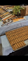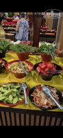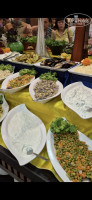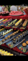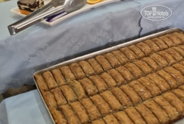 В обед и ужин давали курицу в разных проявлениях,тушёная,жареная,на гриле,фрикадельки из говядины тоже разные,были и тушёные и на гриле и тушёные с баклажанами,что-то вроде люля-кебаб из курицы конечно,рыба запечённая и форель на гриле,сердца,индейка,вот не было только свинины и это понятно в мусульманской стране,поэтому привычного шашлыка там не будет,за ним вам в Сочи ехать.Гарниры так же на выбор из макарон,картофеля фри,риса,булгура,тушеных овощей типа брокколи,шпината,цветной капусты или той же картошечки с мясом.Так же куча овощных салатов и разных заправок к ним.Закуски:сыры и разносолы,овощи гриль,оливки и маслины,с косточками и без,даже фаршированные и многое другое.Стол десертов это вообще отдельная статья,там было столько разных пирожных,что за неделю мы не перепробовали и половины,торты,эклеры,пахлава,а фрукты 3 раза в день и всегда свежие.
