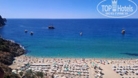 Наверное, самый большой плюс отеля-это близость замечательного пляжа Клеопатра. Вода действительно очень чистая, голубая. Купаться нужно уходить либо вправо от отеля, либо влево, потому что прямо камни , и после захода, которые покрыты какими-то склизкими водорослями не очень приятно, а вот возле пещеры Дамлаташ просто что-то невероятное - Мальдивы одним словом. Людей на пляже довольно много. От отеля нет шезлонгов и зонтиков, их можно, при необходимости, арендовать прямо на пляже за отдельную плату. Я не арендовала, поэтому стоимость не подскажу. Пляж немножечко не совсем чистый, спасибо нам же - туристам. Окурки, семечки крышки от напитков, фисташки, и чего там только нет...