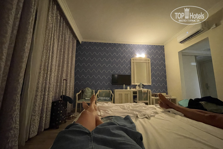 Стоит и про проживание в комнате упомянуть. Наш номер в отеле был хорошеньким, ванная комната красивая, всё уютно, симпатичный балкон. Гель для душа, шампунь и кондиционер для волос во флаконах наполнены. Фен есть. Даже пепельница на балконе стояла. Номер был в корпусе 8 на 2 этаже, рядом с баром, где по вечерам играла музыка, но это спать не мешало. В целом номером довольна, замечаний нет.