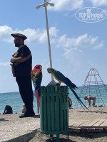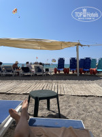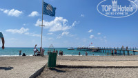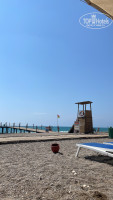 Основной вход в море очень каменистый и после захода в море по пояс резкий обрыв, дальше только вплавь. Советую заходить в море с пляжа справа от пирса, где начинается пляж другого отеля. У них вход песчано-галечный и в воде когда заходишь по колено уже меньше гальки, очень удобно. Море шикарное, соленое, в период нашего проживания были небольшие волны, на них плавать в удовольствие. Сильно в стороны не уносило. Удивило, что на пляже предусмотрены спец коляски (стояли отдельно шт 6-8) для инвалидов, молодцы что так предусмотрительны. Но инвалидов не видела, коляски пустовали. Есть платные шатры для уединения, в них столик со скамейками и рядом на песке шезлонги. В первый день тк мы заехали рано, то успели занять лежаки в первых рядах, а весь последующий отдых спали до 9, потом завтрак и только потом на пляж, где уже все первые 3-4 ряда лежаков были заняты, но стоит отметить что лежаков много и всем достанется, пусть не близко к воде. В обед обычно большая часть отдыхающих уходили с пляжа и вполне можно было переместиться ближе к воде. Пляж чистый, у лежаков стоят небольшие кувшины-урны, очень удобно. Каждый вечер сотрудники их очищали. Понравилось, что гости отеля были интернациональны, встречались немцы, украинцы, итальянцы, македонцы, русские и др.
