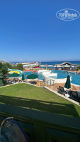 На территории есть два бассейна: один большой и один поменьше по глубине, там три горки — ребёнок с удовольствием катался и купался. Но сами мы в бассейнах почти не бывали, весь день проводили у моря на пирсе.