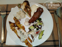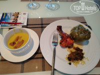 Ресторан6не большого размера но места хватало всем. На входе стоит или девушка или молодой человек, управляющий рестораном видимо и записывает номер комнаты. Если вы питаетесь по системе завтрак - ужин то второй приём пищи можно перенести как на с обеда на ужин, так и наоборот, только нужно заранее обратиться с этой просьбой на ресепшн. Будьте готовы к тому что завтрак в день прилета и обед в день отлёта не положен. По разнообразию питания вопросов нет. Курица, говядина, баранина, рыба есть всегда. Фрукты есть на каждом приёме пищи. Торты и муссы на обед и ужин, на завтрак - изобилие булочек и круассанов. Так же на завтрак готовят яичницу или омлет по вашему желанию, есть каши, мюсли, яйца в крутую, арахисовая и шоколадная паста, тосты, оливки, греческий сыр. На обед 2 вида супов, рекомендую чечевичный. Обед и ужин в целом похожи. Официанты подходят и наливпют воду или сок.