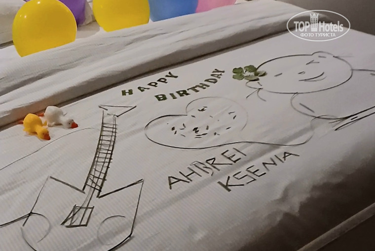 В сентябре случилась спонтанная поездка в этот замечательный отель. Я путешествовала с двойняшками 12 лет. На даты поездки выпал день рождения детей. Очень приятно было в этот день получить подарок-комплимент от отеля- два торта и две бутылки шампанского.