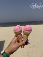В прошлом году маленький пляж повлиял на рейтинг, который я поставила отелю. В этом году пляж намного шире, лежаков больше, достаточно чистый. У моря много ракушек, это доставляло дискомфорт, стопы пару раз порезала (и не только я), два дня был шторм, а до него откуда-то принесло кучу камней, в море было очень больно заходить, камни были под ногами, из-за волн другие камни били ноги (у меня до синяков, к сожалению). Так что мой совет-берите кораллки! На случай если опять прибьет много ракушек и камней.