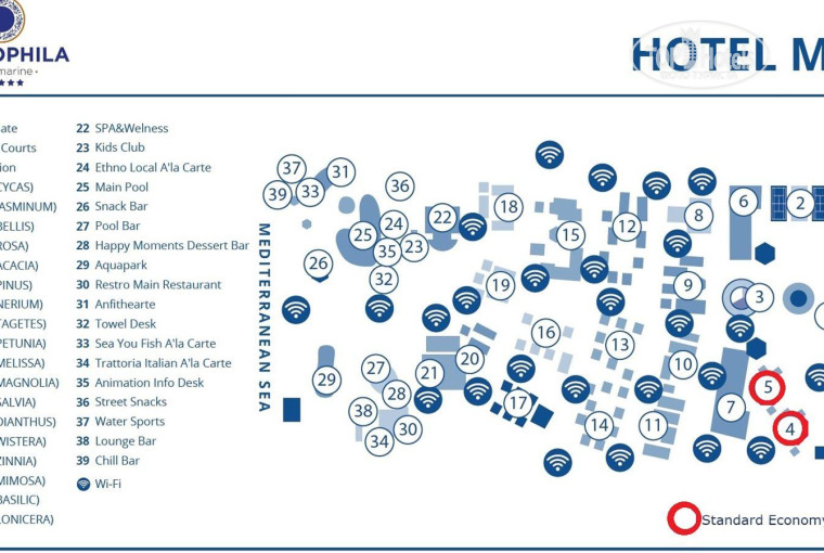 Отель находится в поселке Бельдиби. Территория отеля очень зеленая и тенистая, настоящий сосновый лес, немного разбавленный другими растениями. В этом лесу в пять рядов расположены 18 двух- и трехэтажных бунгало. У некоторых бунгало балконы 1-го этажа и, соответственно, пол комнат находятся на уровне земли и даже ниже уровня земли.