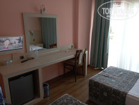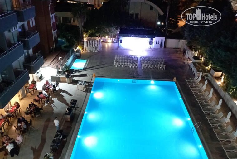 Отдыхал с женой в этом отеле со 2-го по 16-е октября 2025. Заселили на два часа раньше в 208 номер с видом на бассейн. Номер укомплектован тапочками, шапочками для душа без мытья головы. В шкафу нашёл рем комплект для одежды с иголкой нитками пуговицами и губку для чистки обуви. Номер убирают каждый день. Полотенца и постельное бельё меняют с какой-то периодичностью (не отследил с какой) . В октябре прохладно ночью, до 14 градусов спать под вафельным одеялом холодно. Попросили у уборщицы одеяла, принесла шикарные лёгкие одеяла в пододеяльниках. В ресторане кормят в основном тушёной едой и сладостями. Жарят мясо на улице возле бассейна. Выпивка стандартная : пиво, вино, крепкий алкоголь местного производства. Ну и чай, кофе, соки, лимонады. В двух барах. (У бассейна и в лобби.) Отель размещён на склоне горы, поэтому имеет сложную этажность. Вод в отель с фасада расположен на 4-м этаже, где находится лобби и один из баров и терраса с видом на море. Схему размещения номеров с первого по четвёртый этаж я привёл на фото. Обратите внимание, что в этом блоке есть номера без окон и балкона. Это номера класса эконом. Имейте это в виду при покупке тура, так как в описании они ни чем не отличаются от стандарт. А вот этим и отличаются. Ещё есть нулевой этаж с рестораном и минус первый со спа. Выше лобби есть ещё четыре этажа, там должно быть всё номера с балконами. На балконе есть полотенцесушитель на 4 места. Курить можно в баре, на терассе и на балконах. Отель заселён в основном немцами. Поэтому персонал говорит на немецком. В лобби бывает женщина покрашенная в блондинку. Она говорит по русски. Вай фай бесплатный берёт только в лобби. Вай фай в номерах платный. 20 евро за 10 дней или 27 евро за 14 дней на один телефон. Работает по всей территории отеля. На пляж идти через калитку возле бассейна. Идти минут семь до набережной и потом влево метров 50 до вывески Сан бич Хилл. Лежаки напиханы очень плотно. Порой сложно пройти к морю, если отдыхающие начинают их двигаться и перекрывать проходы. Погода после 10 октября не очень купальная. На солнце печёт, в тени холодно, прохладный ветерок заставляет мёрзнуть при выходе из моря. Температура воды опускается до 25 градусов. Воздух 24 градуса днём, на солнце ощущается как 30 градусов, а в тени как 20. Вечером 18 градусов, надо одевать что-то с длинным рукавом, или футболку под рубашку одевать. Гулять в античный Сиде лучше по набережной вдоль пляжа. Идти минут двадцать. Да. Ещё важный плюс отеля- каждый день в номер приносят 1,5 литровую бутылку воды. Мы каждый день оставляли уборщице эквивалент 1 евро. Не знаю, влияло ли это как то на уровень сервиса.