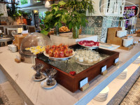 По питанию, мы брали завтрак ужин, на всякий случай, потому что не понимали будут ли рядом подходящие кафе. Можно было выбрать время ужина, и перенести его на обеденное время, питание европейское, по меню, напитки во время обеда/ужина платные. На самом деле можно было бы обойтись без обедов, т.к. в округе большое количество кафе. Завтраки очень разнообразные, много фруктов, выпечки, вкусные соки, готовят супы, омлет, оладьи, есть также необычные местные блюда во втором зале вверх по ступенькам, мы его даже не сразу заметили.