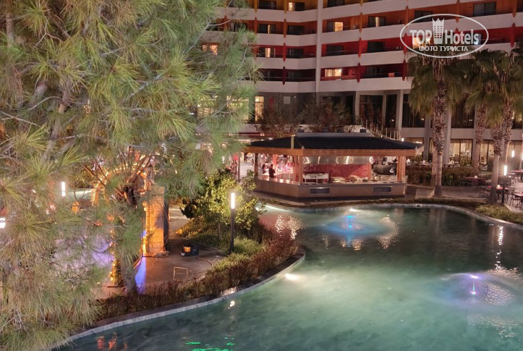 Первый раз летали в Турцию в октябре, обычно выбираем ноябрь. Тур оператор FUN&SUN, авиаперевозчик Azur. Вылет из Екатеринбурга был задержан более чем на 5 часов, из за этого прилетели поздно (ночью). В полете кормили, даже можно было выбирать рис-сосиска или макароны-котлета. Долетели хорошо, прошли таможню быстро , но долго ждали багаж. Тур оператор быстро всех распределил по автобусам (спасибо за оперативность), ехали где-то час, высадили вторыми. В 2 часа ночи были в отеле. На стойке регистрации встретил совсем не говорящий по-русски ресепционист. В бумажках расписались, что-то заполнили, браслеты получили и пошли сами искать свой номер (провожатого не дали...). Нам повезло, номер 1175 был не далеко от лифта. Номер не большой, но всё очень удобно: большая кровать, тумбочки, диван, стол, стулья, мини бар, шкаф, сейф (бесплатно), телевизор, кондиционер централизованный. Туалет и душ очень маленькое помещение (вдвоем не повернуться), но всё есть : гели д/душа, шампуни, фен, полотенца и всякие одноразовые расходники типа ватные палочки и диски, шапочки для душа, пилочки и прочее (короче норм).В шкафу плечики, тапочки (халатов и пляжных сумок нет). Балкон хороший (не маленький) столик, стулья, сушилочка на стене, с видом на фонтаны, аква-бар и ресторан. Боялись будет шумно, но нормально, больше напрягал гриль бар когда жарили рыбу (если ветер в нашу сторону), но тоже решаемо - можно закрыть дверь балкона и всё хорошо! На территории есть спортивные площадки (баскетбол, большой теннис и вроде футбольное поле небольшое), есть теннисный стол на лужайке (очень спорное месторасположение на случай дождя и ветра). Большой детский клуб (внутрь не ходили) , судя по отзывам отдыхающих детям нравилось. Сама территория очень чистая и ухоженная, всё красиво и достаточно логично. Ресторан большой и вместительный, много столиков на улице. Готовят вкусно и разнообразно (об этом многие писали) нам всё понравилось (не буду перечислять что готовят) ассортимент блюд на любой вкус. Из фруктов были персики, нектарины, сливы, яблоки, виноград, мандарины, апельсины, дыня, груши, гранаты (не спелые). Официанты улыбчивые, очень расторопные, вежливые, даже шутить пытаются. Не плохо говорят и понимают по-русски. Бары на территории отеля : мы ходили в три - центральный (работает до 23 часов), у бассейна и аква-бар (до 24 часов) тоже всё нравилось, Любые напитки наливают без ограничений только попроси. Обязательно сходите в кофейню, очень вкусный кофе и пирожные. Мороженки несколько видов в холодильниках по всей территории отеля и на пляже.