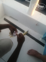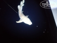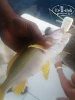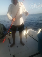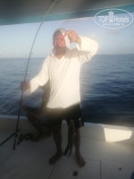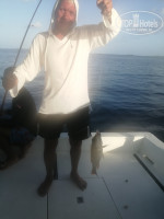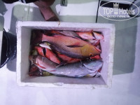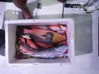 Прилетели мы в понедельник, а на вторник у них по плану рыбалка. Записалось 8 человек, максимальное кол-во. Собрали в 16:00 возле дайвинг центра, провели не большой инструктаж, и повели на катер. Пошли на северо-восток на 6 км, встали с подветренной стороны подводного рифа. То есть на меляк якорь кинули, и ветер нас на нужную глубину на свал отодвинул. Раздали всем катушки с миллиметровой! леской, на конце оливка грамм 80, ещё ниже крючок, какие у нас на судака используют, но только прямой, не офсетник. Вынесли ведро резаной рыбы. Я попросил метр ихней лески, и соорудил снасть на подобие как у них. Глубина метров 20, чувствую кто то щипет снасть, а поймать не могу. Да и ни кто не ловит. Команда (ну местные, которые катером управляют) приняла решение переставиться. Отошли на полкилометра, может километр, опять возле рифа заякорились, закинулись. Опять щипки есть - реализации нет... Кто то из команды уже поймал рыбёху, потом вторую, а я вынимаю крючок - там только шкурка от рыбы остаётся. Думаю надо что менять. Поковырялся в своём пакетике - нашёл оснастку с пятью поводками и небольшими крючками, на жереха у нас такая используется, на окуня можно. Порезал рыбу помельче, насадил, и процесс пошёл! В общем в первую рыбалку я штук семь-восемь рыбёх поймал. Всего штук 15-20 на всех было. Вечером её нам приготовили.