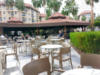 Это я называю,претензия на роскошь,хочется выглядеть,как дорогой отель,но, поэкономим в мелочах,портя общее впечатление, на бутылочках для шампуня .И таких примеров можно приводить много в этом отеле.Стоит на столике раскрывающаяся пирамидка с логотипом отеля,в которой должна быть приветственная шоколадочка,а ее,увы,нет.Также,в номере есть сейф,тапки,халатов не было,хотя заявлены,надо просить,если что . Есть небольшой шкаф с вешалкам ,маленькая плазма БЕЗ русских каналов (обращалась к гестрилейшен,чтоб подключили хотя бы 1 русский канал,техник пришел,но ничего не смог сделать).Мебель, вся , также, явно старая,но функционально ,эргономически устроенна неплохо в 12кв.метрах.Балкончик моего номера был на 2стула по габаритам,но я увидела,что в 6 корпусе есть огромные балконы в номерах,даже с лежаками. Думаю,что и комнатки там не по 12 метров. Русских в них не размещают,судя по всему.На 98% в отеле немцы, соответственно,всё на турецком,немецком ,были ещё несколько человек англоговорящих , немного,как и нас.
