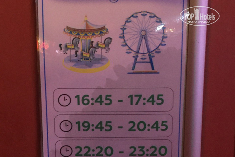Имеется Луна парк бесплатный из 8 аттракционов. В очереди стоять почти не приходилось, лишь на автомобили и качели-лодка. И то не больше 5 минут. Работал после обеда по 1 часу 3 раза. Расписание на фото.