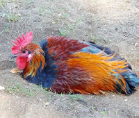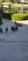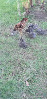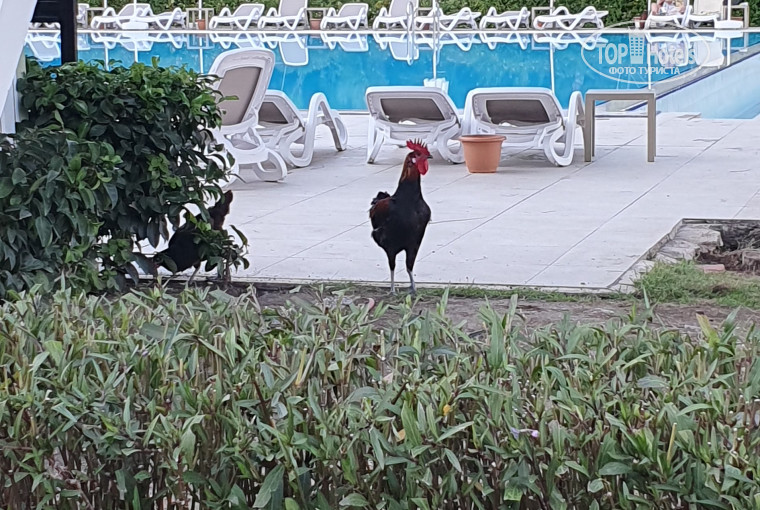 По территории бегают кролики, цесарки, курочки и петух который смешно поет)))