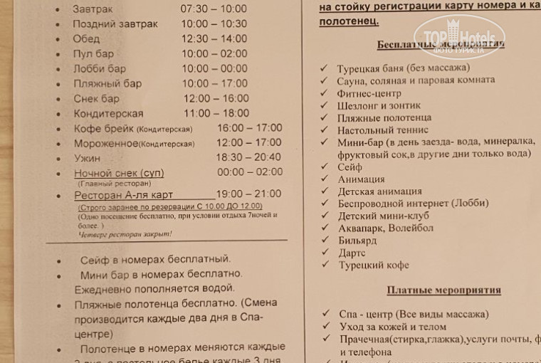 Питание не отличается огромным разнообразием, особенно на завтрак, но всего достаточно, голодать не будете, и каждый может что-то выбрать себе по вкусу. Качество вполне хорошее. Из мяса – говядина, баранина, курица, индейка, колбаса (или ветчина) турецкие (видимо из курицы или индейки). Картофель фри, отварной, запеченный. Пару раз давали пюре – порошковое. Рыба также присутствует, но я не любитель, поэтому рассказать ничего про нее не могу. Макаронные изделия разных видов, яйца, рис, овощи, выпечка, сыры, разные салаты. Суп на обед и на ужин двух видов. Обычные турецкие супы, нам не привычные – супы-пюре или овощные, острые или сладковатые. Но несколько раз были очень даже неплохие. На завтрак вместо супов молочные каши, вроде бы рисовые. Из фруктов были яблоки, сливы, виноград, хурма (что запомнил), лаймы, мандарины. Арбузы и дыни всегда в неограниченном количестве и свободном доступе (я думал, что арбузы уже отойдут к этому времени), вкусные – не та дрянь, что продают в наших магазинах. В кондитерской возле малого корпуса давали очень вкусное мороженное. В снек-баре понравились гамбургеры, шаурма (правда островатая). Возле снек-бара с 11 часов женщина печет турецкие лепешки гёзлеме с картошкой или сыром – я ел их каждый день, очень нравились. Из напитков – чай, кофе, фанта, спрайт, кола, разноцветная химическая вода. Айран только в баре у пляжа (так себе, жидковат). Из алкоголя – как обычно: водка, джин, виски, вино, пиво. Пиво очень приятное – легкое и напоминает немецкое. Что удивительно – очень понравился виски: привкус наподобие шоколада, пьется приятно. Правда, дают его только в лобби-баре и в баре у бассейна. Коктейли попробовал пару раз - невыносимо сладкие, больше их не брал.