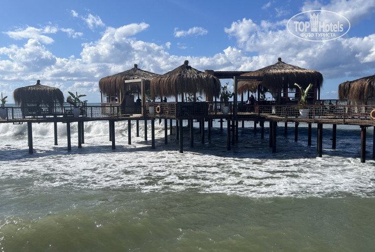 Пирс: пирс это изюминка отеля- он прекрасен. На пирсе есть бар, работает с 10-00 утром выпить чашечку чая или кофе с видом на море- Боже это так красиво! Также на пирсе можно перекусить, работает кафе с 12-00 по 17-00 - в меню гамбургер, чизбургер, салаты, паста, десерты- все вкусно и красиво оформлено. На пирсе можно арендовать кабану, нам очень понравилось в ней отдыхать, по стоимости 50 евро в день.