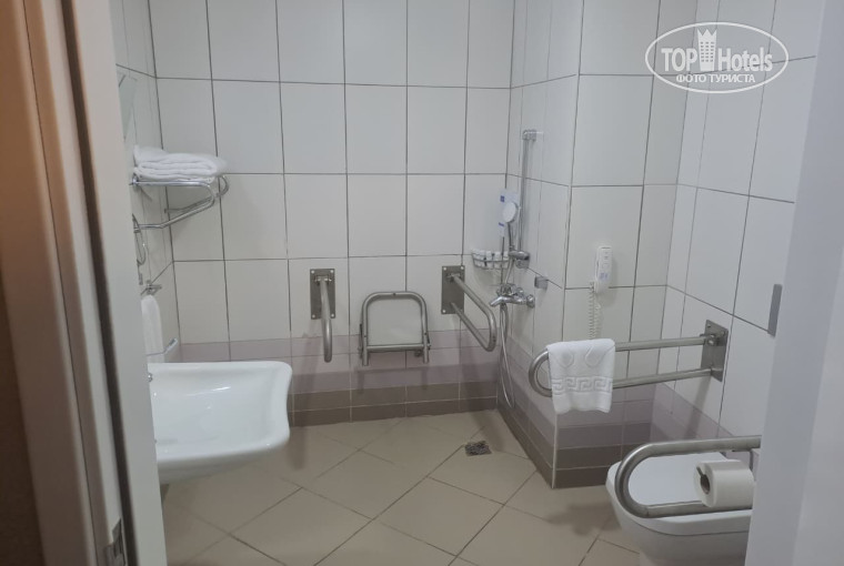 1. Заселение. На три человека дали две кровати, третья не входила, но обещали уплотнить мебель, без проходов оставить, метраж номера явно был занижен. Далее в номере почуяли неладное, он был странный, много керамической плитки, низкие зеркала с уклоном к полу, какие-то поручни везде... а когда зашли в ванную, можете увидеть на фото. Это номер для инвалидов-колясочников. Причем изрядно потрепанный. В качестве душа дырка в полу. Ничего не имею плохого к инвалидам, всегда помогу, но нам этот номер зачем!? Пошли на ресепшн менять. Там отказ, высокий сезон, других номеров нет. Долгое препирание, что у нас забронирована другая категория номера и оплачена. Дошло до ругани. Потребовали вернуть деньги и заказали такси, только это помогло. Начали шевелиться. Нашли другой номер, но сказали, что он шумный. Мы не предполагали, что такой... К шуму привычны, народу много в отелях, дискотеки, это же не санаторий. Номер выходил на технические здания соседнего отеля. На фильтровальную станцию. Шум такой, буд-то ты у двигателя самолета стоишь, что с закрытым балконом, что без. Тут свихнуться можно. Сил уже не было, прилетели мы под утро, легли спать. Далее было еще три дня штурма ресепшена. Отель построен так, что выходит либо на свою кухню окнами, либо на центральную парковку с каруселью трансфера, либо на технические здания соседних отелей. Далее у нас был вид на помойку, кухню соседнего отеля и в конце всетаки добыли более-менее номер. Такого дурдома у нас еще не было. Кто-то может сказать, что придираетесь, зажрались. Нет, такого мы еще не видели, не предполагали, что бывает. В итоге газон, потом дорожка, запаркованная авто, далее забор, далее другой отель, везде технические сооружения. Но если смотреть поверх, то справа море (видно пляж соседнего отеля), слева горы. Красиво. Но нервы на пределе. Однако и за меньшие деньги было получше. Друзья прошли ту же полосу препятствий. В процессе разборок на ресепшене выяснили, что мы далеко не первые и не последние. Хороших номеров у них очень мало, надо брать самый верх и торцовые с видм на море, но их всего ничего. Ну и вишенка на торт - дно в водорослях, не анапа, но неприятно. Кто готов пройти экшен, вторая часть.