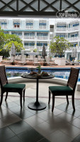 Ресторан тоже просторный с видом на бассейн. Места всем хватает, можно сесть на диване, можно с видом на бассейн. Прилетают дрозды (могут воровать еду), но зато как красиво поют.