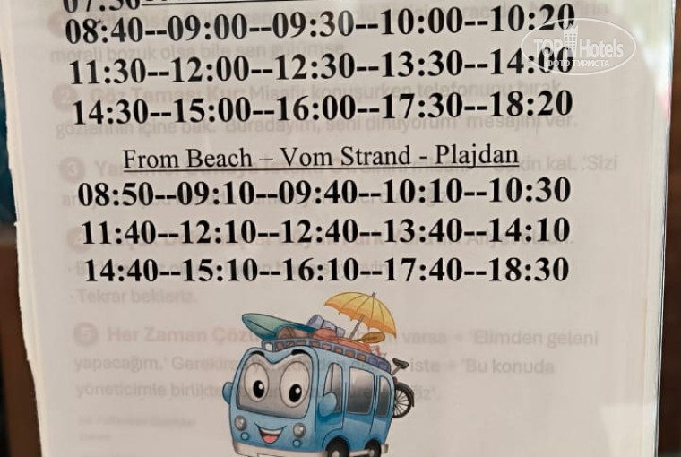 Пляж: сам пляж - отличный! Песок, чистый, пологий вход, мало народу. Но пешком - идти не очень удобно. По развозке - бывают большие перерывы (см. фото).