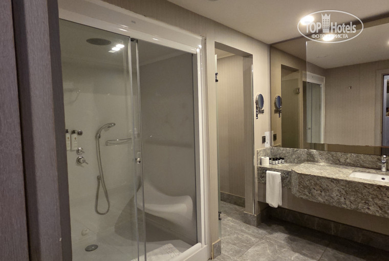 Наш номер очень большой, огромный. 2 санузла, один с паровой. Немного не хватает шкафа/полки в ванной, унесли туда одну из тумбочек. Кровати удобные, подушки нормальные.