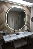 7) По наполнению номера. Сейф цифровой (открывается удобно - вверх) есть. Халаты - есть. 2 раковины, ручной душ (верхний - бутафория, не включается): см. фото. Шампунь, гель для тела, кондиционер (фото). Кровати, подушки: для меня - удобные вполне. Соседей практически не слышно, мешают, если курят на соседнем балконе. Унитаз с европейской системой смыва (не американской, когда наполовину всегда наполнен водой). USB розетки в номере есть. Неплохой телик Samsung, но нам он не нужен.