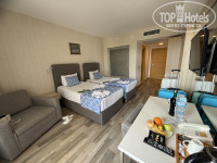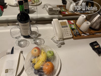 В номере есть все необходимое: набор моющих средств, зубные щетки, пена для бритья и бритва, мини бар с напитками, комплимент в виде фруктов и литровой бутылки вина, сейф, халаты и тапочки.