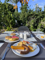В ресторане на завтрак есть красная слабосоленая рыбка. яйца в разных видах, блины и оладушки, тосты и каши (их не пробовали, как обычно, в Турции это крупа в большом количестве молока).