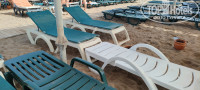 Они все разные, много сломанных. Естесственно, грязные. Есть на них матрасы, такие же по чистоте, они либо кучей свалены в середине пляжа, либо таскаются с одного лежака на другой...