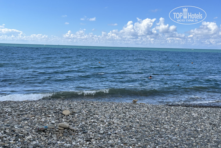 Пляж : камни , сложный заход в море . Есть бар и включенные вафли, мороженое и еще что там сладкое .. это не ели . Лежаков хватало . Мусора, грязи нет . Но пляжный туалет убил : древние « дырки в полу» на постаменте , куда и здоровому влезть сложно, а если есть проблемы с ногами , так вообще .. двери не закрывались , вонь .. прям откат в пионерское детство и летний лагерь ..