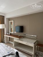 Номер в основном здании был с видом на бассейн. Номер большой, мебель светлая. Красивая, белая.