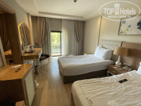 Прилетели достаточно рано. В 11 часов уже были в отеле. Отдыхали двумя семьями плюс мама. Брали три номера. Какие-то номера заселили прям быстро, какие-то позже. Но в любом случае - попал в отель и можно идти в ресторан, в бассейн и тд. Браслетов, кстати, нет. Были удивлены (но в Турции давно не были, может теперь так везде). По поводу номеров - В каждой из двух семей по двое детей разного возраста. Вторая семья брала Сьют однокомнатный - в этом же крыле, что и мы, но чуть другой загиб здания и вид у них был хороший. У мамы был стандарт напротив нас по коридору - вид на выход из отеля внутри комплекса - тоже вид супер. А так как дети у нас взрослые (10 и 15 лет), брали двухкомнатный номер family. Вот тут и был для нас основной не очень приятный момент. Номера данной категории находятся только в одном месте, по одной стойке как бы. Вариантов для вида из окна просто нет. Номера друг под другом фемили на разных этажах. Соответственно, вид один. И он не волшебный. Попробую приложить фото. Причём нас сначала заселили довольно быстро на нулёвой этаж. Это вообще ужас и кошмар. Как дети подземелья. Пожаловалась на ресепшен, сказали, что освобождается на 1 и 5 этажах такой же номер. Выбрали первый, чтобы быть с родственниками на одном этаже (у них был первый этаж). Первый этаж был не настолько плох, как нулевой.