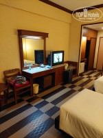 В делюксе есть чайник и фен (кладут по 2 пакетика с кофе, сливки и сахар) в отличии от номера ROH. Есть телевизор с русским каналом, мини холодильник, 2 бутылки воды каждый день, шампунь в пакетиках, мыло маленькое и шапочка для душа. Полотенца банные 2 штуки и для лица 2 штуки, их каждый день мне меняли. Постельное бельё 1раз в 3 дня меняли, белье чистое, хотя немного изношенное. Каждый день уборка, выносят мусор- вполне всё прилично. Единственное , что напрягает, это состояние системы кондиционирования, всё в пыли и грибке, воздух оттуда не самый чистый задувает в номер.