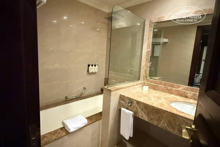 Сам номер просторный: большая двуспальная кровать, два стула и кофейный столик, мини-бар (платно), чайник, кофе/чай (по 2 шт., пополнялись ежедневно), две стеклянные бутылки воды по 0,75 л. Нам было маловато воды, так как много пьём — просили пополнение на ресепшене либо подходили сами, либо звонили по номеру «0».
