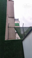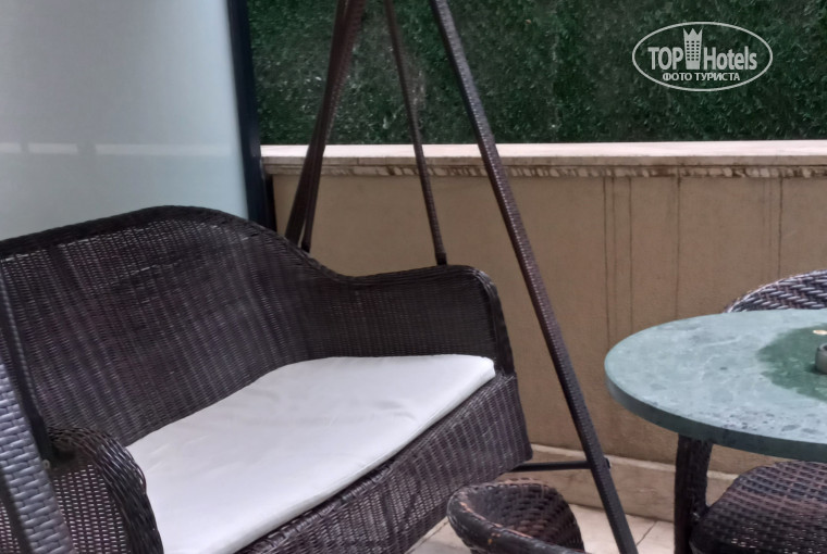 Бронировали семейный сьют на 2 ночи. Для тех, кто путешествует с детьми-подростками, на мой взгляд, семейный сьют это оптимальный вариант. Два номера разделены небольшим коридорчиком в который ведёт общая дверь из корридора отеля. В одном номере три односпальные, а в другом одна двуспальная кровать. В каждом номере своя ванная комната, так что вы вроде бы вместе, но у детей своё личное пространство. Так же есть небольшая веранда с качелями, столиком и стульчиками, но выходит она во двор-колодец, задекорированный искуственным газоном и колючей проволокой. Ну такое себе.