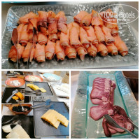 На обед и ужин тушеные и гриль - рыба, утка, курица на вертеле, телятина, говяжий язык, ягненок. Для любителей посолониться копчёная и солёная рыба, китайская кухня, суши/роллы, нежный салат из крабов, рыбный день изобиловал морскими дарами, возвышающимися на блюдах горами креветок, кальмаров, мидий и прочих моллюсков. Из фруктов на все приёмы пищи: бананы, цитрусовые, киви, зерна граната, груши, яблоки, хурма, шелковица, клубника, рядом креманки с сахарной пудрой и сливками.