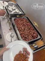 Завтрак скромный, голодным не будешь, но вкусно покушать вряд ли получится. Так сказать поесть ради поесть. Яйца вареные, сосиски, сэндвичи с прослойкой из овощей, каша водянистая, хлопья, сыр фета, фасоль в томатном соусе, панкейки/блинчики, тосты, макароны (а-ля ролтон), мёд, варенье. Вода, сок, молоко, чай, кофе.
