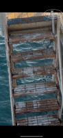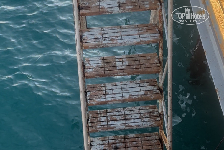 Вода которая задерживается на пирсе около душа, сливается в море и течёт по лестнице спуска к морю, из-за этого лесенки очень скользкие и в море присутствует мелкие щепки.Зонтики на пляже , это какой-то тяжёлый люкс , то из нужно перематывать мусорным пакетом, то они далеко не презентабельные.