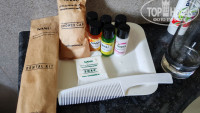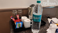 Еще в номере большая кровать с удобным матрасом и дополнительное односпальное место (по умолчанию заправлено простыней, а подушка и одеяло в стенном шкафу). Не понравился способ заправки кровати - подтыкают одеяло вместе с простыней под матрас. Достаёшь одеяло, и вылезает простыня. Избыток подушек – четыре подушки, но все не очень удобные, слишком плотные (кому-то, возможно, это наоборот плюс). Есть кресло и небольшой столик с эффектной каменной столешницей. Из кухонного оборудования маленький холодильник, охлаждает не быстро. Лед, скорее всего, наморозить не сможет. Из посуды только чайник, два стакана, две чашки и две палочки вместо ложек. Ни ножей, ни вилок, ни открывашки. Каждый день приносят по 2 литровых бутылки воды (если попросить, то дадут и больше без проблем), по четыре пакетика чай, кофе, сахар, сливки (на самом деле обычно получается больше, похоже просто охапкой берут).