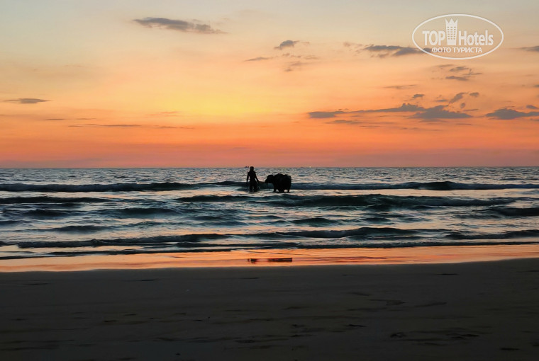 Пляж великолепный! Широкая полоса пляжа тянется на 24 километра. Песок очень мелкий. Там, где мокрый – очень плотный. Местами скрипит под ногами как снег (реально!), тактильно, похоже, как будто идешь по крахмалу. Очень интересное ощущение! Пляж чистый. Коровы тут не пасутся (пару раз проводили буйвола вдоль воды и только).