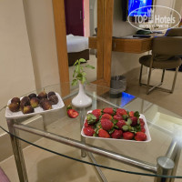 Мой номер - стандарт (прихожая, ванная комната и комната) на 1-м этаже с видом на сад и выходом на террасу. На просторной террасе 2 кресла и столик. В прихожей - шкаф-купе, одна половина которого с плечиками для одежды, а вторая - с полками для вещей и размещения сейфа. Напротив шкафа- вход в ванную комнату с застеклённой душевой кабиной, раковиной, навесным унитазом и полотенцами (банными, для лица, для ног). Есть шампунь и гель для душа (кондиционера нет), туалетная бумага. В комнате кроме двери на террасу есть еще окно. На окне и двери - прозрачные занавески, а также шторы блэк-аут, обеспечивающие свето- и шумопоглощение: убедилась, если задёрнуть шторы, звук в комнату не проникает. В комнате под окном что-то вроде эркера, в котором уместился диванчик, а перед ним журнальный столик со стеклянной столешницей и фарфоровой вазочкой с цветами (!) Одна большая кровать с двумя прикроватными тумбочками по обе стороны и светильниками. На одной из тумбочек - телефон для связи с ресепшен, бумага для заметок, карандаш. Напротив кровати на стене телевизор, под которым стол-консоль с рекламными материалами отеля, рядом кресло. Есть большое зеркало (в пол), холодильник, кондиционер, электрический чайник с набором чай-кофе-сахар, бутилированная вода. По запросу - утюг в номер (бесплатно). Номер убирали ежедневно, бельё тоже, аккуратно раскладывали по местам мои разбросанные вещи и обувь, а из полотенец на кровати каждый раз выкладывали сердца, лебедей, человека в моих очках (!).