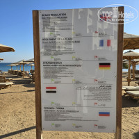 Море - это достояние отеля! Бухта, огороженная буйками от выхода в открытое море, в которой не чувствуются приливы и отливы! Плавный заход, который вскоре переходит в глубину, песчаное дно. По акватории бухты на разном расстоянии от берега разбросаны спасательные круги (для тех, кто не сможет доплыть без отдыха до буйков). Безопасность в море обеспечивается спасательной службой: спасатели с 8-ми утра и до 5 вечера размещены на пляже в местах, откуда бухта контролируется наверняка. Сам пляж песчаный, огибает бухту, выходя с востока полуостровом. Получив пляжные полотенца (а это целые махровые простыни цвета моря) и заходя на пляж со стороны отеля, видишь стенд с правилами пребывания на пляже на разных языках, включая русский. Тут же туалет (всегда чистый с туалетной бумагой), открытый большой душ , ванночка для смыва песка с ног (их на основном пляже 2 - у каждого входа-выхода с пляжа). На пляже в несколько рядов зонтиков с лежаками и матрасами, а также экранами от ветра. В этом году на грибках закрепили флажки, поднятие которых должно означать, что грибок занят. Повсюду установлены керамические урны для мусора разных цветов, такие же, как и по всей территории отеля. Если нужно передвинуть лежак или экран, можно позвать дежурного по пляжу. Пляж, как и всё в отеле, расположен очень удобно: близко до корпусов, ресторанов, бассейнов. Есть бар, бургерная, где также дают картофель-фри.