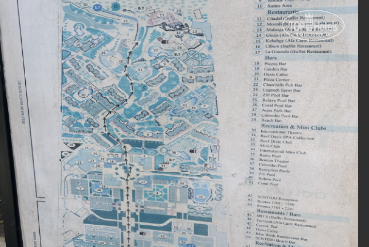 8. Рестораны, бары, Аля Карт. Про посещение ресторанов, на завтрак обед и ужин, я описал немного выше. Кроме центрального, особо ничего не могу сказать т.к. сам читал отзывы постоянных клиентов и выбор ресторана МОС, был сделан осознанно. Т.к. проживал рядом с центральным входом на ресепшн, баром пользовались исключительно в центральном корпусе. Бармены уже знали наши предпочтения и приносили необходимые напитки без промедления и томительных ожиданий. Безусловно, не забывайте благодарить неким денежным эквивалентом 💵и будет вам счастье. На пляже 2 бара. Один полноценный на правой стороне (если лицом к морю) и второй на стороне пляжа для гостей зоны SENTIDO. Бар этой зоны – это небольшой сарайчик с прохладительными напитками, коктейлями, водой и пивом. Честно говоря, ну могли бы сделать хотя бы подобие павильончика, чтобы не так выглядело ущербно в разрезе полноценного бара в правой части пляжа. Скажите придираюсь. НЕТ! Констатирую факт! К слову сказать, гости SENTIDO, могут пользоваться двумя барами, а гости REEF OASIS, только своим. Из алкогольных напитков🥃, не могу выделить ничего. Некоторые отдыхающие, в отзывах писали, что боле менее текила и джин неплохи, но попробовав и то и другое, больше к ним не возвращался тем более, что привык брать алкоголь проверенный в дьютике🍾 и не изменяю своей привычке вот уже более 20 лет. Пиво; местное, но пить можно. В баре на ресепшн, наливают из бутылок и разливное. Кстати, тут же делают отличный кофе. Рекомендую! На пляже только разливное (с 09-00 в зоне пляжа SENTIDO) в пластиковые стаканчики. Как всегда, термо-кружка меня выручает. Преимущества: во-первых, долго сохраняет напиток холодным и во-вторых, позволяет не отвлекаться на лишнее хождение в бар. Берите на заметку лайфхак Ресторан Аля Карт. За время нашего отдыха, нам удалось сходить только в Итальянский ресторан. В общем, это отрытый ресторан на террасе и находится в глубине напротив выхода на территорию отеля со стороны ресепшн, за бассейнами. Ресторан не впечатлил. Такое же тусклое освещение, как и в номерах, что даже, при изучении меню, приходилось включать фонарик в телефоне. Гастрономических изысков, не ожидайте. Читал про это в отзывах, поэтому перед посещением ресторана, сходил сначала на ужин, и позже убедился, что поступил правильно Второй раз, я бы точно не пошёл бы в Итальянский ресторан. Единственный плюс, это обслуживание и не более того.