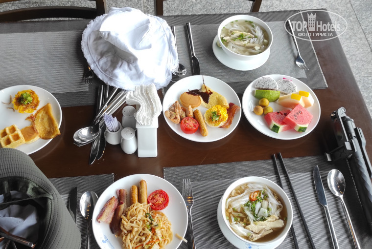 Питание - завтраки (учитывая, что нас 3,5 человека на весь отель) - вкуснейший Фо Бо и его разновидности, рис, лапша, овощи, фрукты, выпечка, яичница, бутерброды, колбаса (съедобная), бекон, сосиски, сухие завтраки, чай, кофе, соки, смузи.
