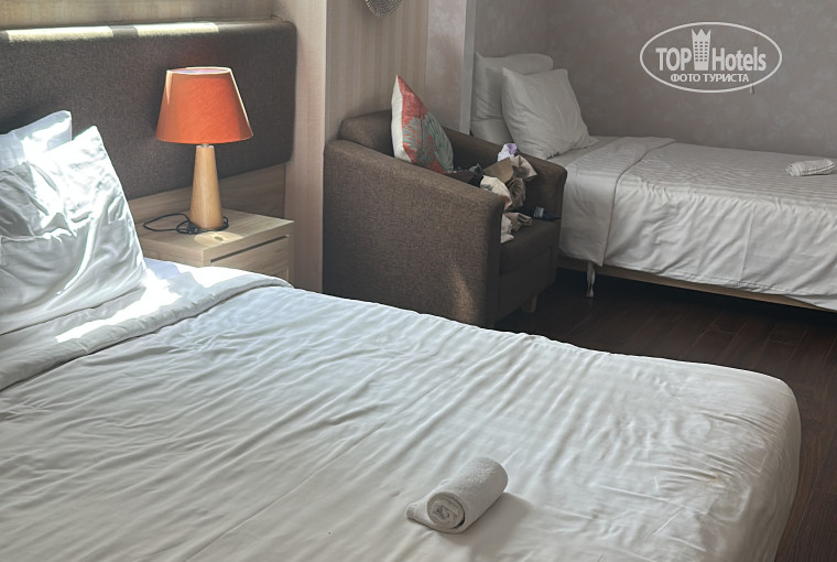 Номер попался 604, одна двухспальная кровать и одна односпальная, в номере есть чайник, холодильник, чай кофе вода каждый день обновляется.