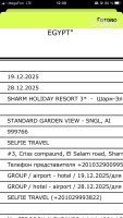 Всем привет! Отдыхал в отеле 19.12.2025г-28.12.2025г от туроператора ITS. Организацией моего отдыха туроператором ITS остался доволен. Обращаю внимание, что на сайтах Level. Travel.ru и Travelata.ru отель Sharm Holidey указан 4*, что не соответствует сертификату отеля ( см фото сертификата), отель Sharm Holidey соответствует 3* , что и было подтверждено при получении мной ваучера в отель Sharm Holidey туроператором ITS. Отдыхом в отеле остался доволен. От аэропорта до отеля ехали 20 минут. Отель расположен на возвышенности и в стороне от центральных улиц, в достаточно не шумном месте, до песчаного пляжа идти под горку около 15 минут, обратно в небольшую горку....Рекомендую ознакомиться с фото концепции отеля, где есть полезная информация, в том числе, что в день заезда завтрак не включен в систему "все включено", при раннем заезде, завтрак вам предложат оплатить отдельно.... Отель заполнен туристами из разных стран, были итальянцы, англичане, поляки, россияне, белорусы. украинцы и т.д. Туристов было много, заселили в 14ч в корпус 2, номером остался доволен ( см фото), бесплатный сейф, сантехника исправная, небольшой холодильник, с горячей водой проблем не было, плотный матрас, четыре прямоугольные и не высокие подушки, комаров, муравьев и другой "живности" в номере не было, постельное белье хорошего качества, уборка в номере по заявке. Бассейн с горками подогревался. Много было туристов с детьми. Отель не далеко расположен от обменного пункта валют, основных магазинов, представителей сотовых операторов связи Египта. Было чисто в ресторане, барах, на территории отеля. Питание без изысков, качественное, однообразное, голодными не будете, были очереди в ресторан. Алкоголь в отеле не пробовал. У отеля нет своего пляжа. Для поездки на песчаный и коралловый пляжи, надо получать ежедневно пропуск у сотрудника отеля. Мне больше понравился не большой песчаный пляж (см фото), который расположен в бухте, был заполнен туристами из разных отелей, свободное место найти было можно, на пляже лежаки бесплатно, вода, напитки и тд приносить на пляж запрещено, надо покупать в баре на пляже. В аэропорту купил местную сим-карту 40 Гб интернета ,за 12 S, можно было выбрать от 10 Гб и разной цене, в аэропорту продавали сим карты все четыре оператора сотовой связи Египта, при покупке местной сим карты представитель сотового оператора подключал сим карту, убедившись, что у вас интернет в телефоне есть, принимал оплату. Как выяснилось позже, покупка местной сим карты в аэропорту была выгоднее, чем у представителя встречающей стороны в автобусе.