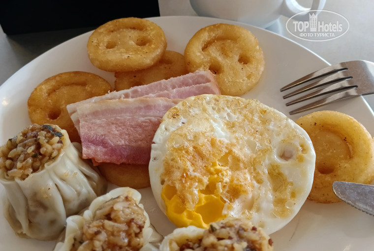 Завтрак : яичница всех видов, варёные яйца, драники, паровые булочки баоцзы с разной начинкой, ветчина, сосиски, картофель тушеный или фри приготовленное кружочками, рис, лапша, утка, курица, говядина, батат, тушенные овощи, были и на пару цукини и брокколи , выпечка немного скудная,
