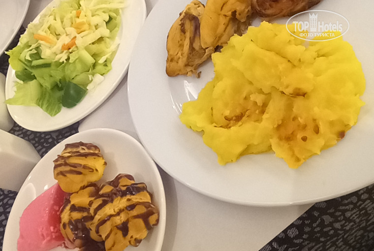 Теперь , ВНИМАНИЕ!: Пишу эти строки для непритязательных туристов с небольшим бюджетом (ну иначе вы бы вообще не зашли на страничку этого отеля). Если нужно дешевое жилье близко к морю и хорошему пляжу - то вот оно есть. Больше ничего нет. Не рассчитывайте на сервис и питание в привычных нам рамках. Берите без питания и далее два варианта: или сами добываете где-то еду или заходите в столовую, смотрите , что есть (мы так делали с ужинами) и если подходит, то платите деньги прямо в столовой ( завтрак 25 дирх., обед и ужин по 35 дирх.) и идете набирать еду. Нам понравились ужины за эту цену, всё было вкусно. Фото одного из ужинов нашла и приложу. Не оплачивайте заранее питание , что бы потом не пришлось там падать в обморок и жить в унынии. Воду тоже можно набирать в столовой.