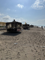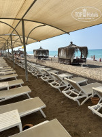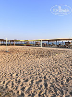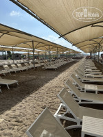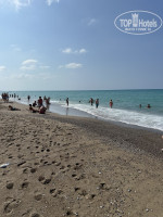 У отеля его визитная карточка – это несомненно огромный и красивый пляж, он просто огромных размеров. Много пролётов шезлонгов с накрытием. Мы шли на пляж в 9:30 и всегда были свободные лежаки, как у бассейна. Так и на пляже. На пляже прямо свободные пролеты были. Пляж песок и при входе мелкая галька. Есть поле для волейбола. Море в 2021 году было спокойное. В 2025 году немного беспокойное, но мы плавали в море.