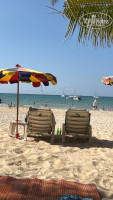 На пляже есть кафе и столики на песке, идеально подходящие для обеда или ужина с видом на морской закат.